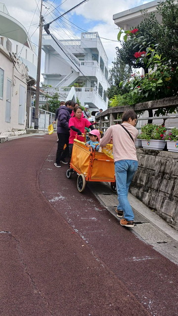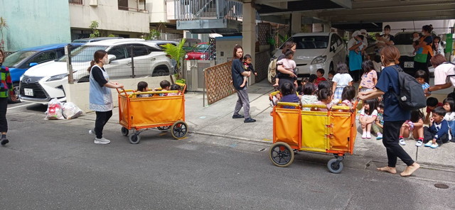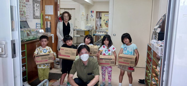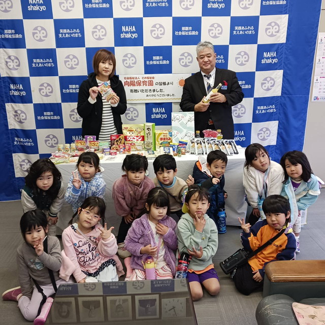 フードドライブで集まった食品を那覇市社会福祉協議会へ持って行きました(4.5歳時)