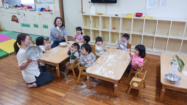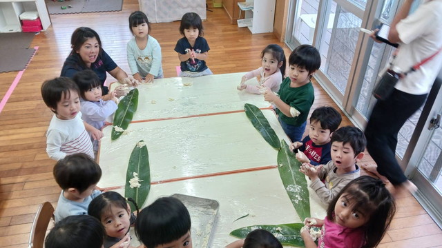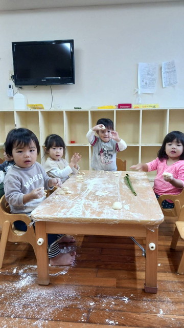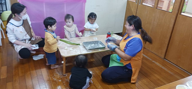 【1.2歳児】ムーチーの代わりに小麦粉粘土でムーチー作り体験を行いました(2024.12.6)