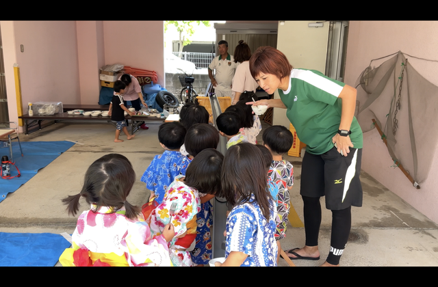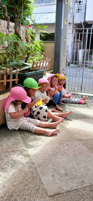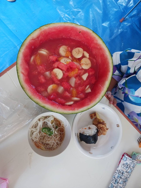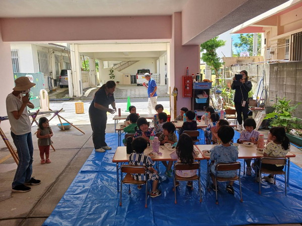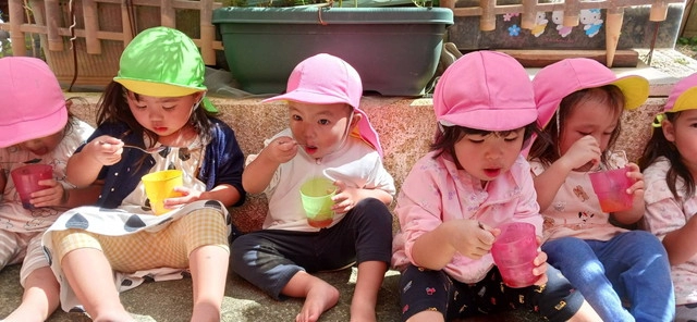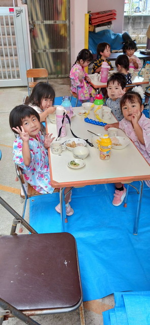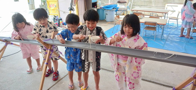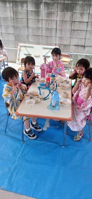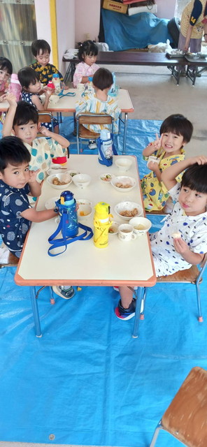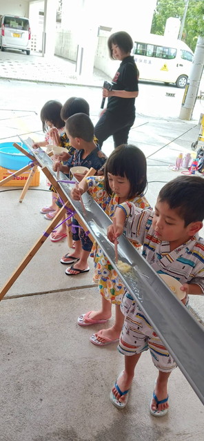 その後は『そうめん流し』を体験し、お外で食べる給食に大喜びです♪(2024.7.5)