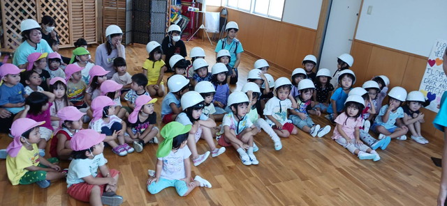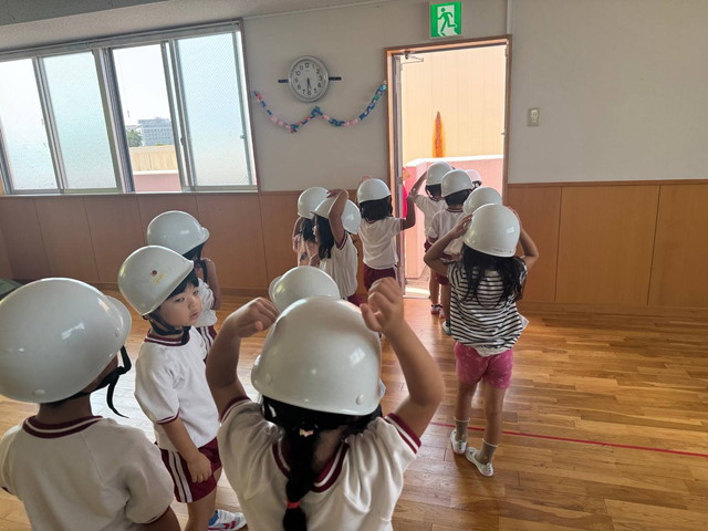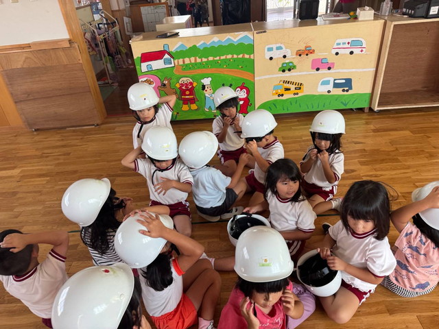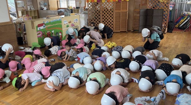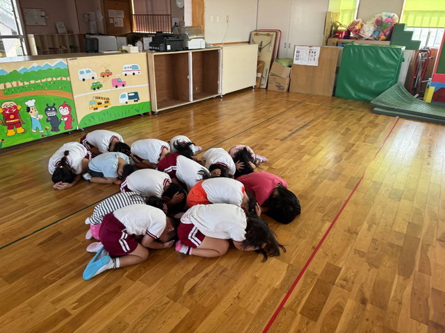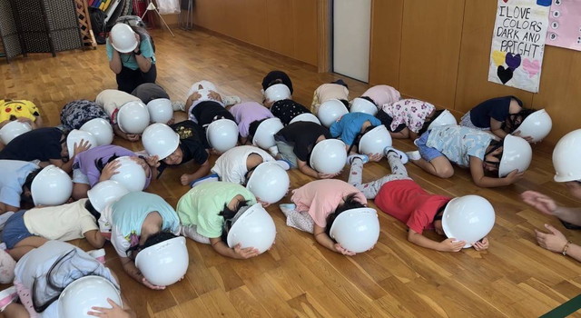 ヘルメットを被り「亀さんポーズ」で身を守る練習です。